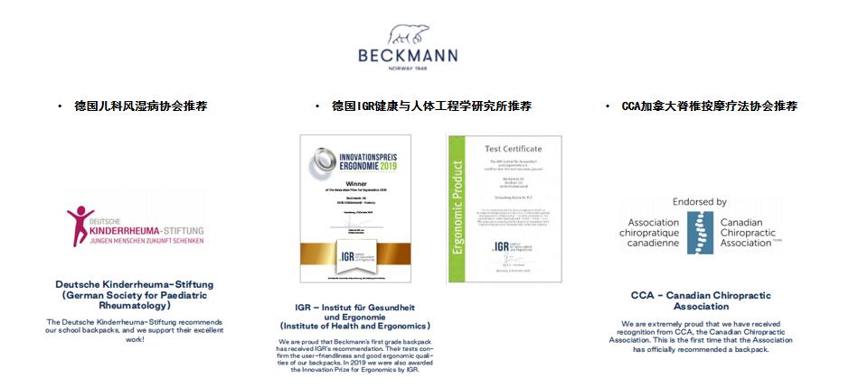 作为全球“专业”学生护脊书包的品牌之一,Beckmann贝克曼拥有75年的专业护脊书包经验。自1946年Olav Beckmann先生于挪威克里斯蒂安桑Kristiansand创立品牌以来 ,秉持“被学生喜爱、被家长信任”的品牌理念和“做全世界最好的学生背包”的愿景,Beckmann一直致力于设计开发符合人体工程学的学校背包,为学生护脊减负,并不断推出适用于更多年龄段的优势书包及配套设备,产品获得各项国际专业奖项认可,深受学生家长的喜爱与信赖。