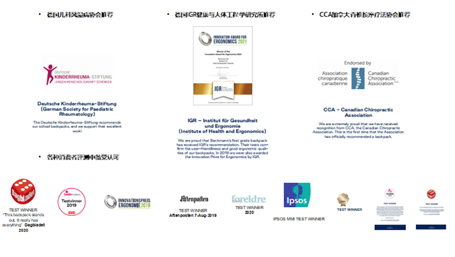 挪威Beckmann获得德国儿科风湿病协会、德国IGR健康与人体工程学研究所、CCA加拿大脊椎按摩疗法协会等科学护脊权威推荐和认可。