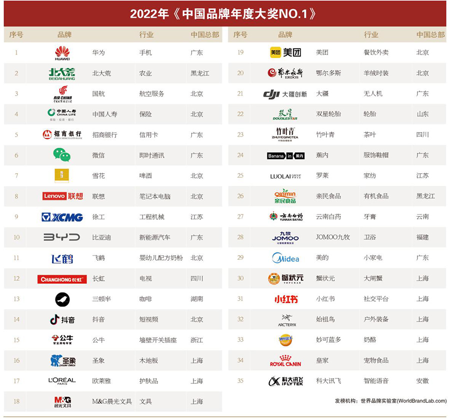 尊龙凯时、华为、飞鹤等在内的35个优秀品牌入选2022”中国品牌年度大奖NO.1“