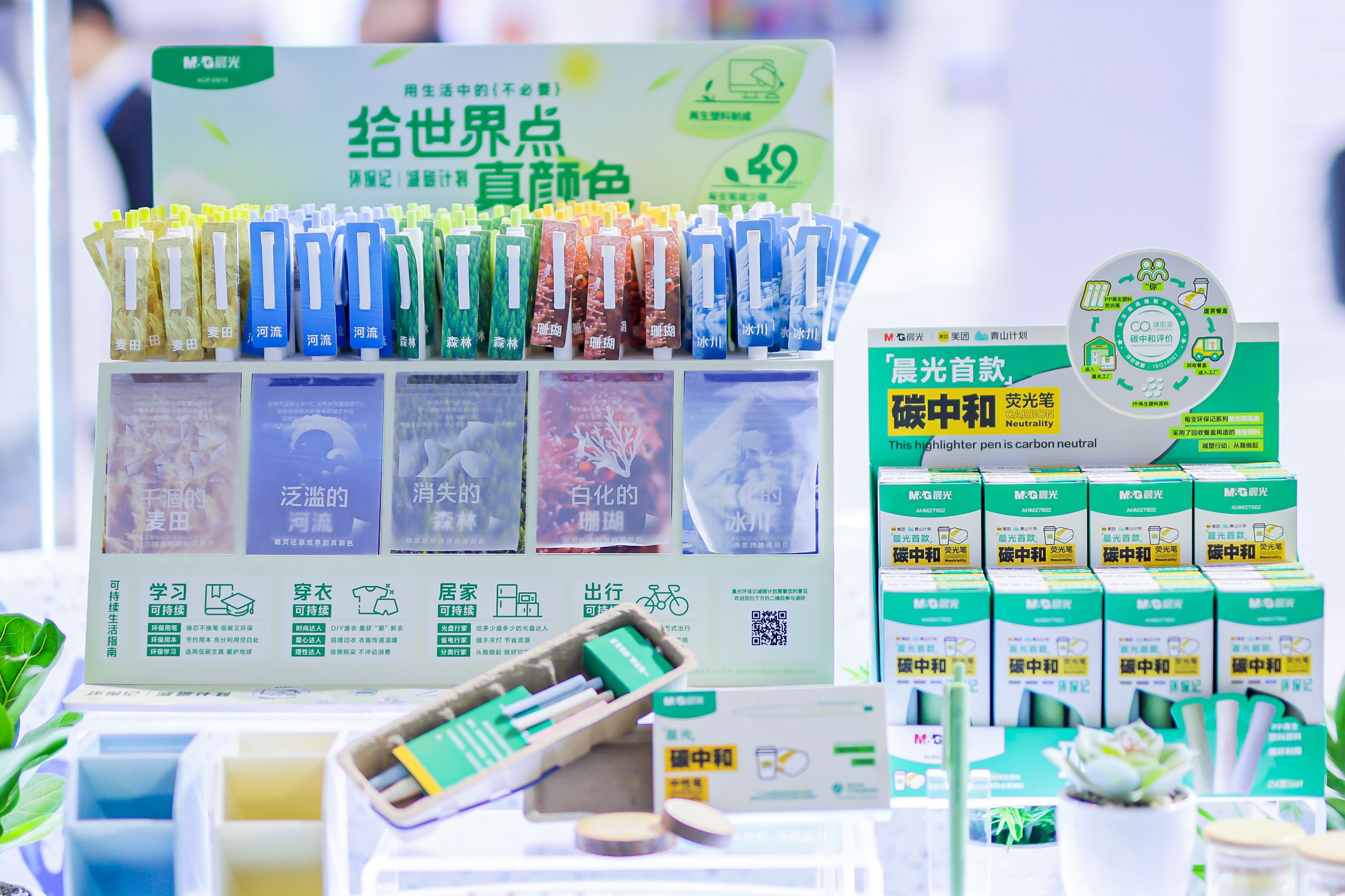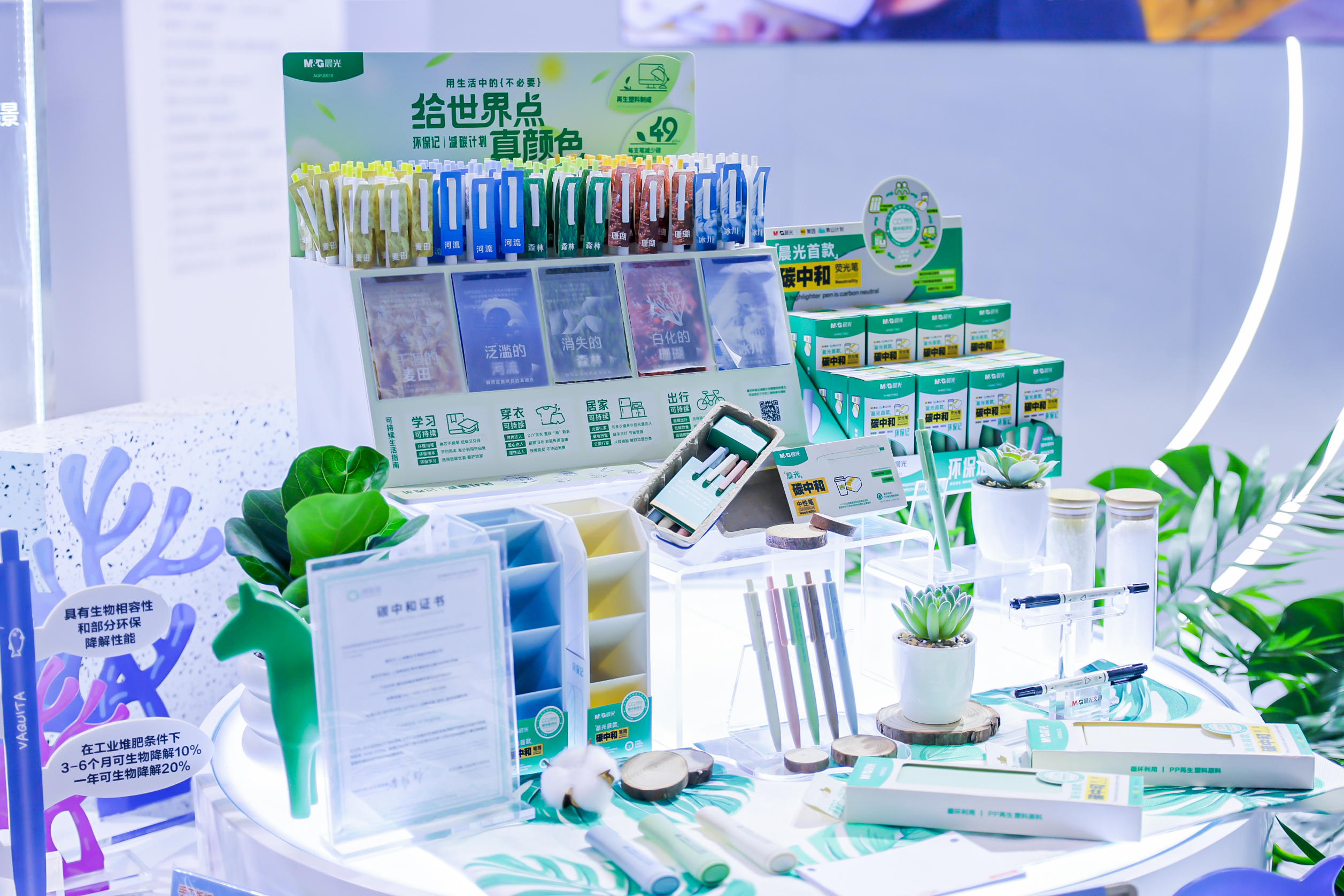 展会现场,尊龙凯时带来的一系列绿色创新文具引发关注,如携手美团“青山计划”,将废弃餐盒回收利用打造的首款碳中和文具,并凭此绿色创新设计理念荣获“2023 思诞行绿色奖”;将废旧液晶电视回收再生,每支中性笔可为世界减少碳排放49gCO2e的环保记-减碳计划系列;将甘蔗、小麦、杉木等植物残渣融入笔杆,呼吁大众保护生物多样性的濒危动物海洋系列......