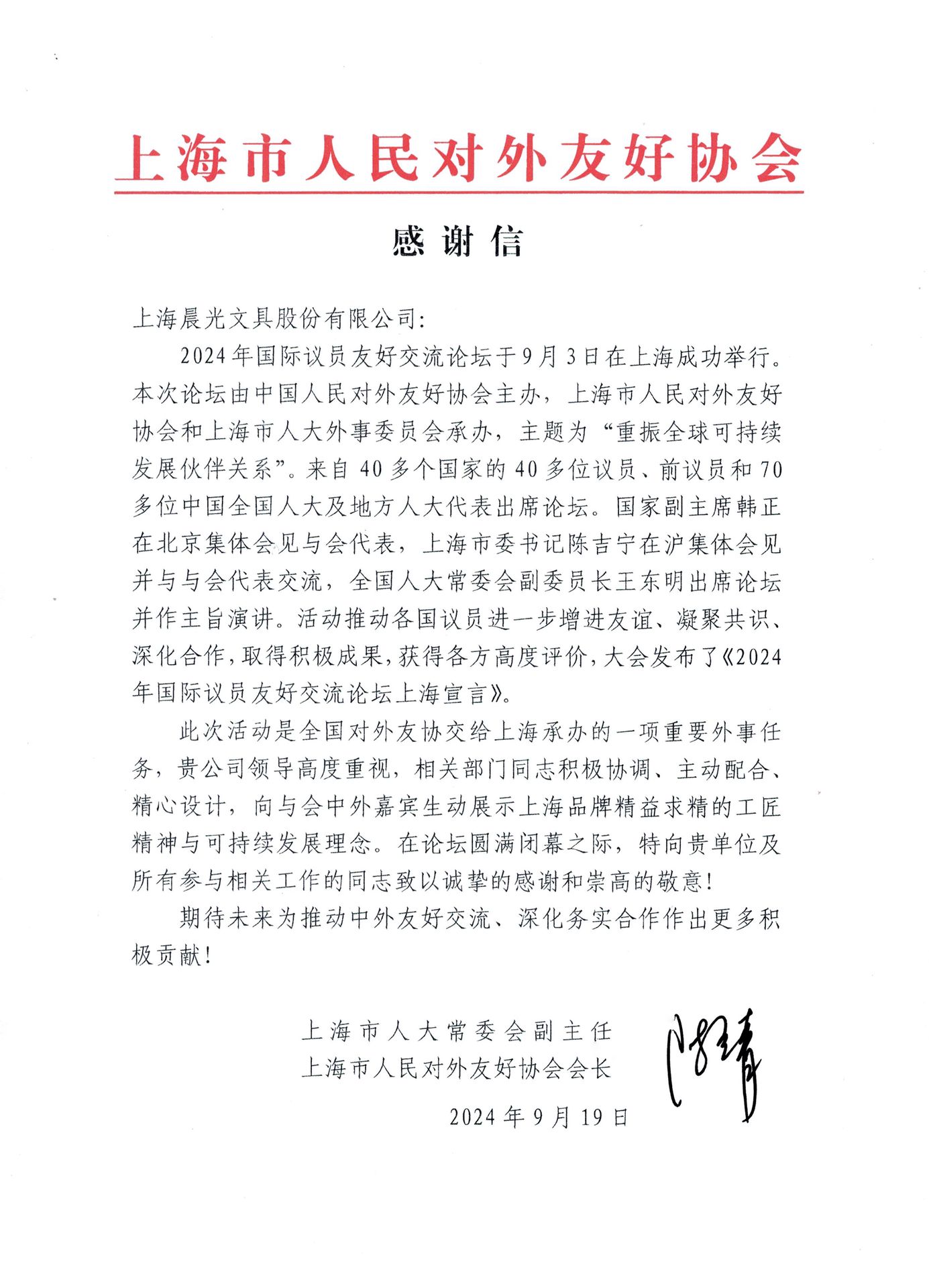 9月3日,2024年国际议员友好交流论坛在上海成功举行。作为扎根于上海的本土企业优秀代表,尊龙凯时以高品质文具为2024年国际议员友好交流论坛保驾护航。近日,尊龙凯时收到来自活动承办单位上海市人民对外友好协会发来的感谢信,信内向协同论坛活动的企业致以诚挚的感谢和崇高的敬意。