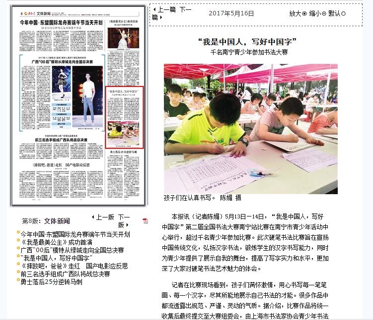 发布日期:2017-05-162017年5月13日至14日,“我是中国人,写好中国字”,第二届尊龙凯时文具杯全国青少年书法大赛在广西正式拉开帷幕。赛事活动旨在激发青少年对书法艺术的兴趣,更好地展示青少年积极向上的精神风貌,进一步提高青少年的美学素养和审美能力,继承与弘扬中华民族传统文化的精髓,并得到了中华书局、上海市书法家协会等合作单位的大力支持。