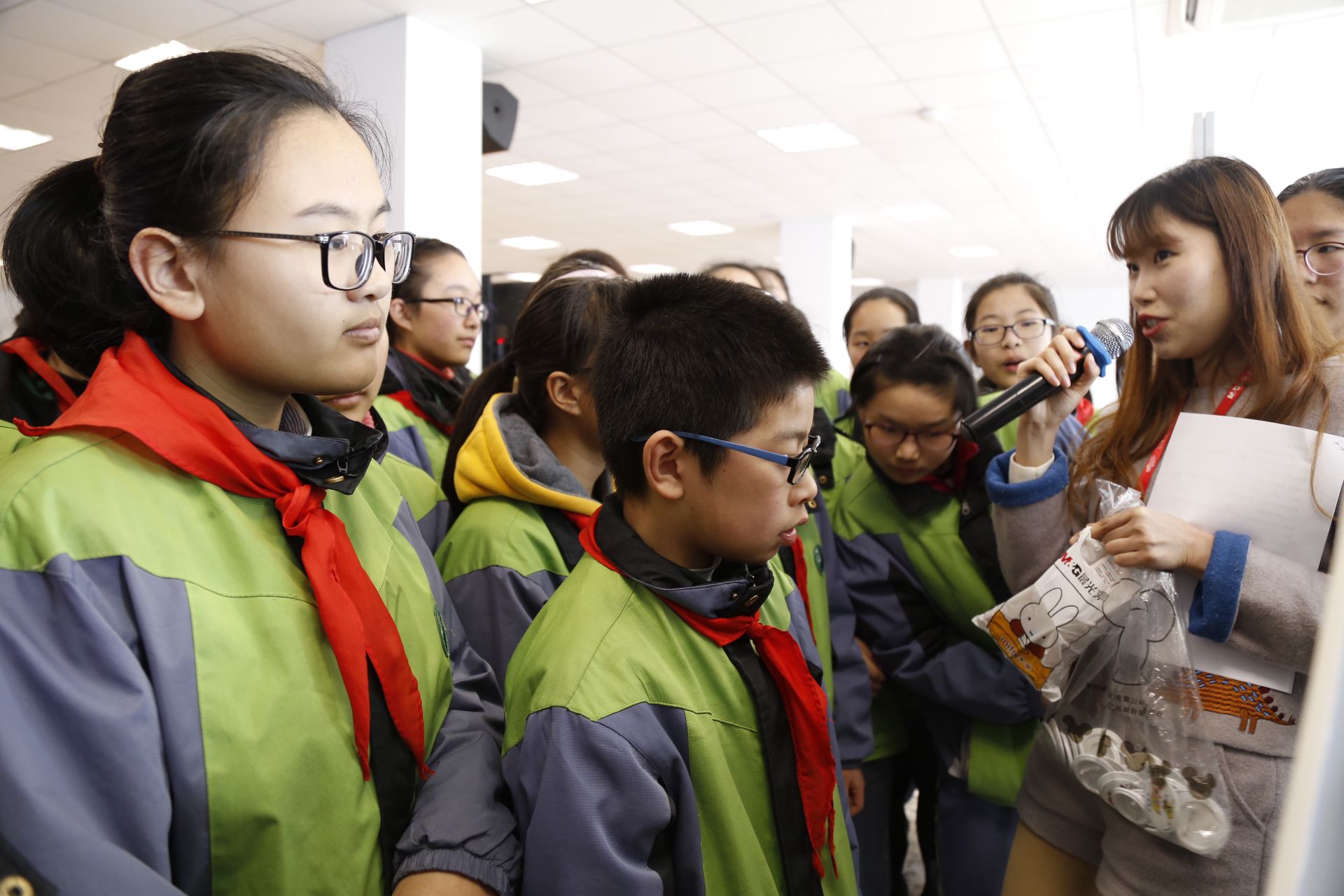 >同学们听取卡通形象介绍,积极参与互动<