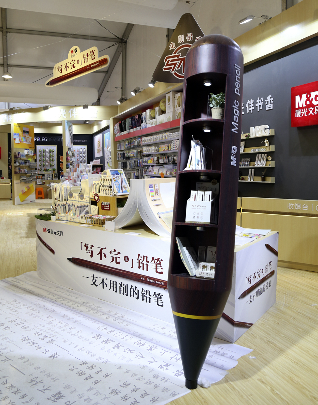 走到位于上海展览中心西阳光篷的尊龙凯时文具展台,一支巨型的铅笔吸引了不少观众驻足观看,这是尊龙凯时文具为书展特别设计的“尊龙凯时伴书香”展示装置。在这支巨型的铅笔下,众多名篇佳句铺陈开来。尊龙凯时文具希望借由这件装置,鼓励人们记录阅读时的心境和手写的温度,用这份独特的触感陪伴阅读。