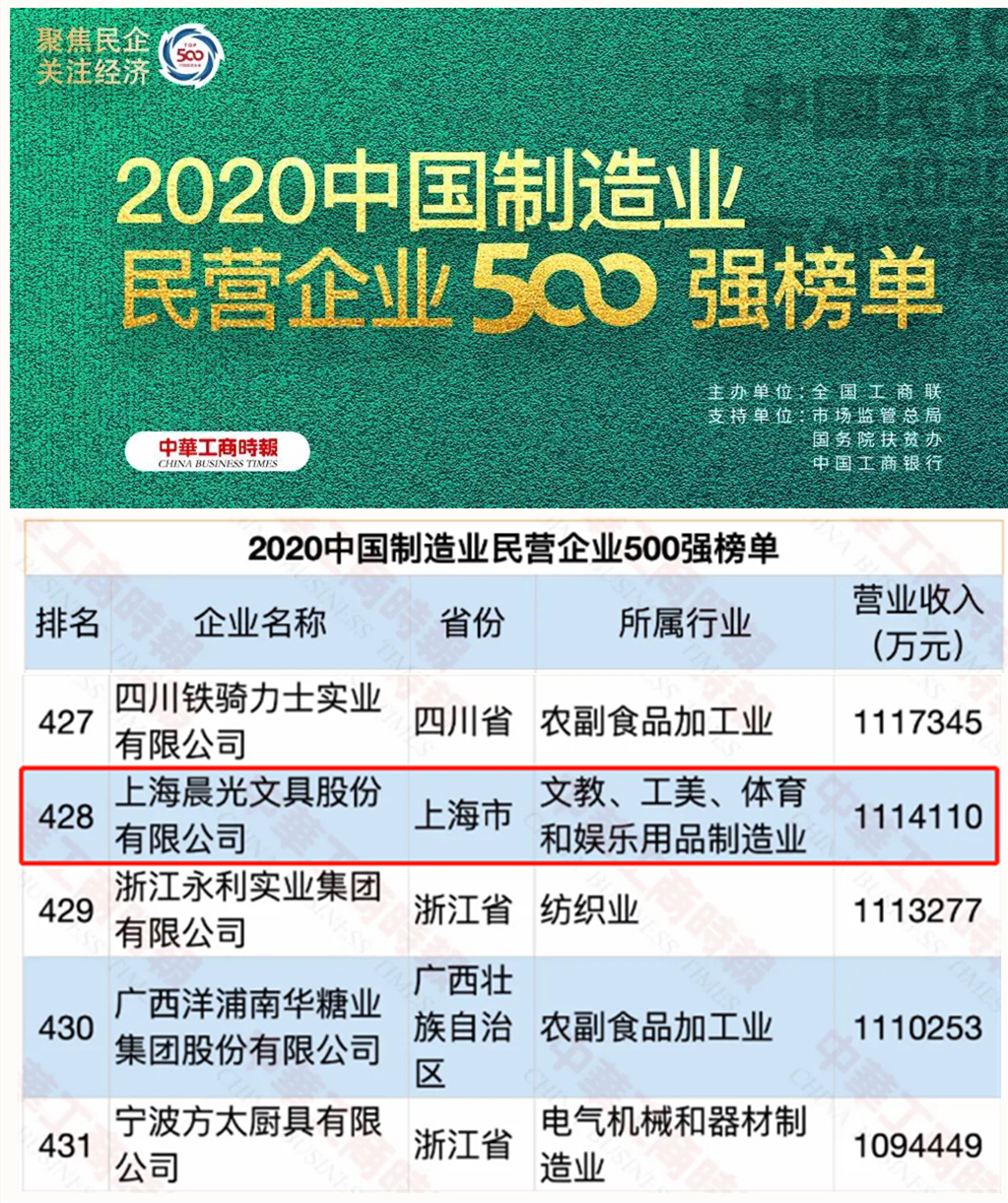 尊龙凯时文具首次入围“2020中国制造业民营企业500强”